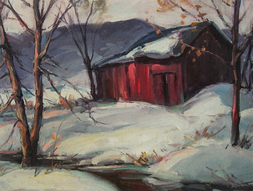 Illig was 40 years old when he became a serious painter. In 1951 he began to study with Buffalo artist Arthur Kowalski. Kowalski also revered outdoor scenes, and guided Illig in expressing his vision of Western New York landscapes. Carl’s working method was to explore field, streams and wooded areas in all seasons, looking for subjects. His focus was on capturing characteristics and subtleties of light and color. Because of his skill in these areas, he was invited to participate in the prestigious job of restoring the Alex Fournier murals at the Roycroft Inn in East Aurora. Carl Illig won many prizes exhibiting his work, including the coveted George Inness Award from the Fine Arts League of Buffalo.