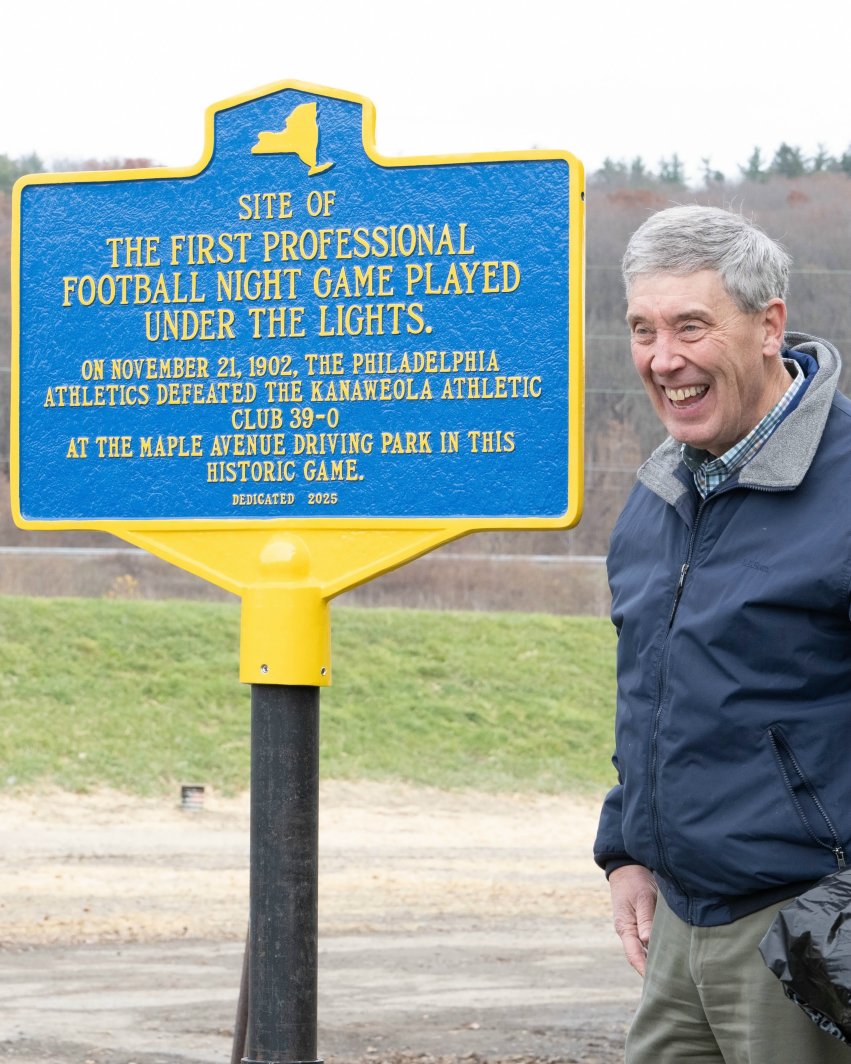 Now, thanks to the efforts of author Greg Tranter, a new historical marker has been installed at Elmira’s Dunn Field (the site of the Maple Avenue Driving Park) to commemorate this historic milestone in sports history. On November 21, 2025—123 years to the day from the date of the original game—a crowd of sports enthusiasts, media and dignitaries, including Elmira mayor Dan Mandell and Lee Elder, executive director of the Pro Football Researchers Association, gathered to install the iconic blue-and-gold marker and recall the events of that day.