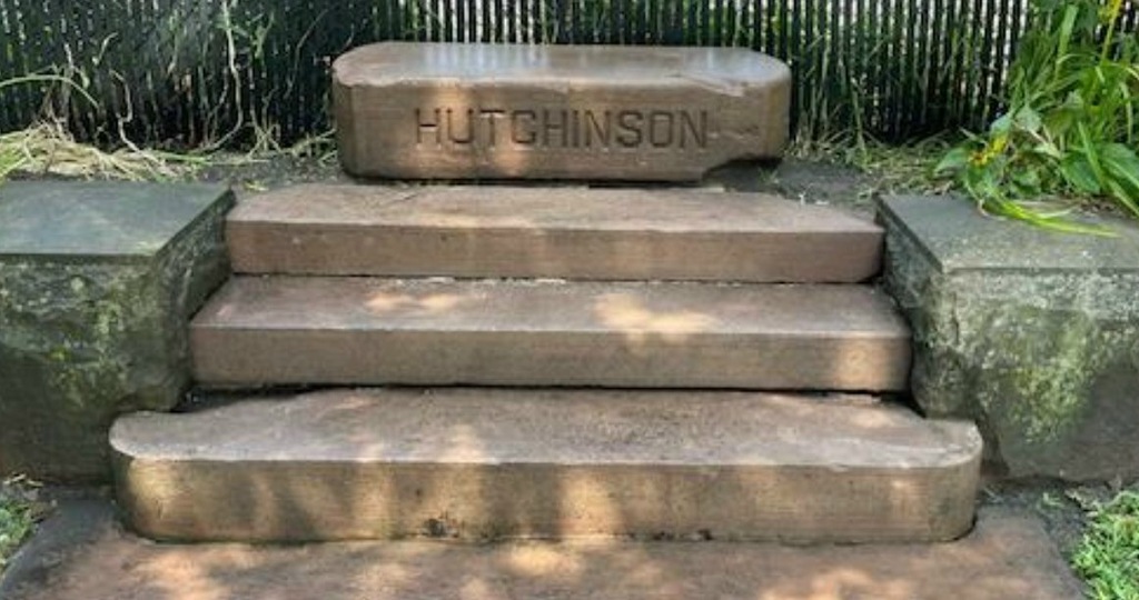 As best recollected, the stone – originally sitting street side on Linwood – was inadvertently scooped up by a city front-end loader cleaning up after a Buffalo blizzard in the 1990’s, as it was hidden in the snow. After noticing the stone was missing and inquiring where it may have been moved, it was feared dumped in Lake Erie or in the Black Rock Canal at the end of Porter Avenue, which was a common local practice. While visiting the Buffalo Central Terminal the following spring to explore potential terminal re-development plans, by which time much of the snow had melted, Tim Tielman noticed and recognized the Hutchinson stone and the address “296” etched on each end. The stone was returned to its rightful location, but rather than place it by the curb, the decision was made to set it at its now prominent spot at the top of the remaining steps. It was centered amidst the sandstone garden wall – together, the remnants of the long-gone mansion that was once home to the Hutchinson family. A missing corner of the stone at bottom front right and a smaller shaving on top is presumed to be a souvenir of its travels.