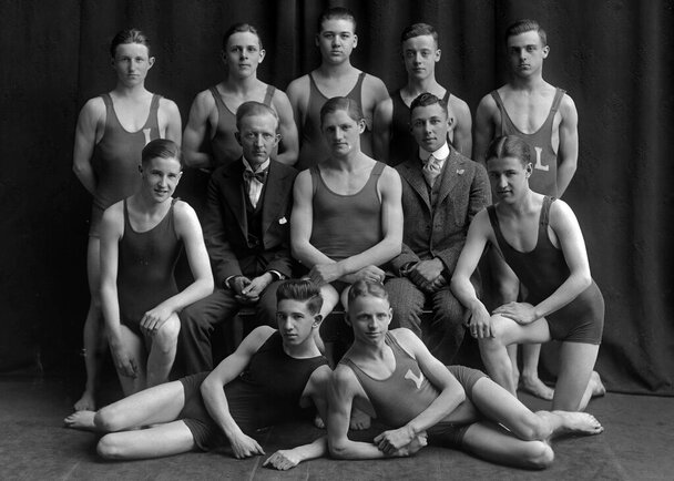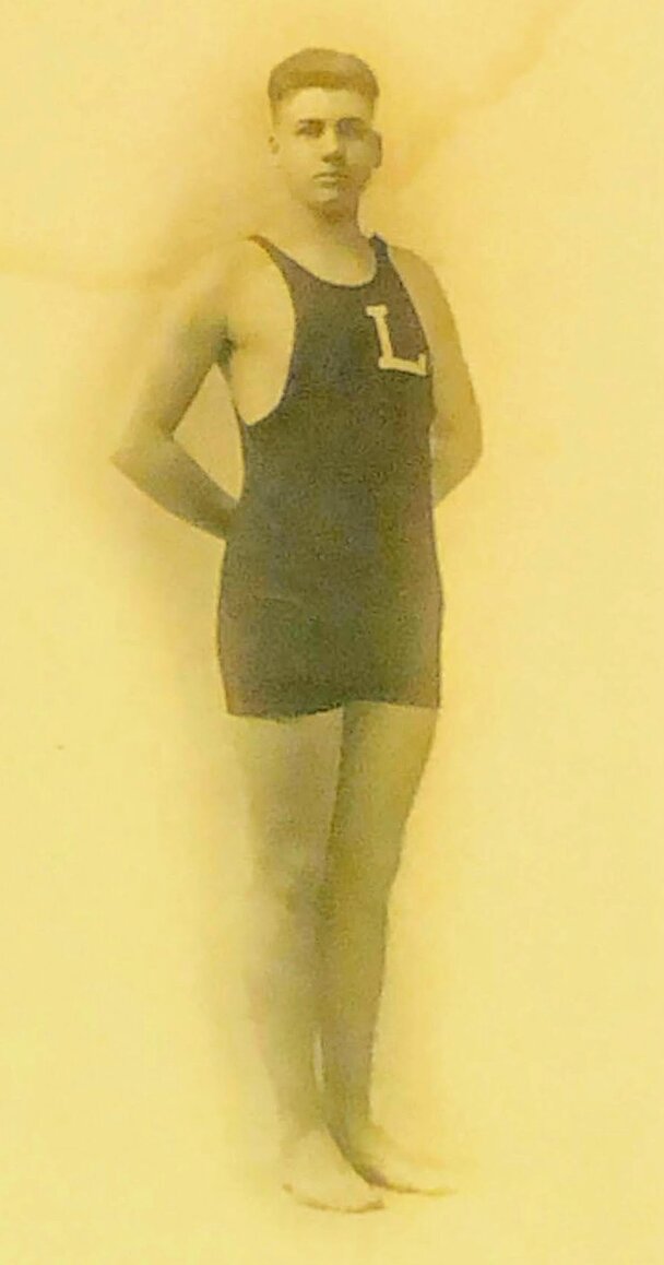 I had called about those photos in your Spring 21 issue regarding Lafayette High School. I was more than surprised to see my Dad's picture on the swim team – back row middle [Page 47]. I promised to send another photo of my Dad in his swimming “costume”- I believe that's what they were called. Dad's name Donald A. Coon. It's taken me this long to find this photo – relatives had it. Anyway, I am sending it now with the hope that it is useful.