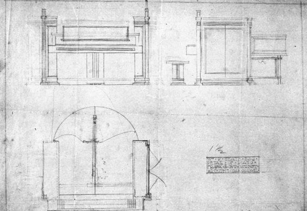 Frank Lloyd Wright designed a grand piano for the Heath House. In the archives at Taliesin there is a drawing of the front, side and top of a monumental piano with storage cabinets incorporated into the sides. It is not known if the piano was ever built.