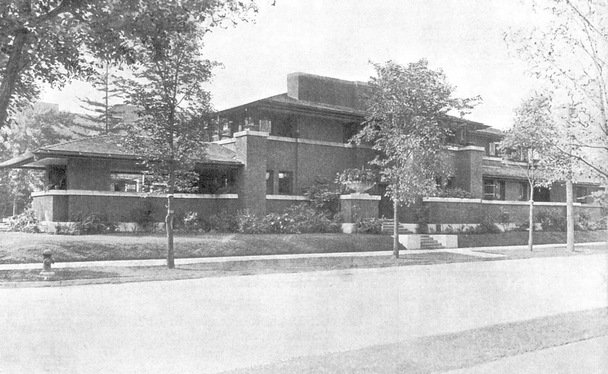A view of the Bird Avenue elevation of the W.R. Heath House shows the house before alterations. A long continuous horizontal line of stone runs parallel to the foundation line and the roofline. The large urn at the entrance is shown at its original height.