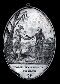 Red Jacket, whose Indian name was Sa-Go-Ye-Wat-Ha, is well-known in Western New York as a great Seneca orator. During the Revolutionary War, he sided with the British, who gave him a red coat which gave him his English name. When the second war for independence began, however, Red Jacket persuaded his people to remain neutral. In 1792, when he traveled to the U.S. capitol in Philadelphia to present the claims and grievances of the Iroquois, President George Washington presented him with the solid silver peace medal, above. Red Jacket greatly prized it and wore it whenever his portrait was painted.