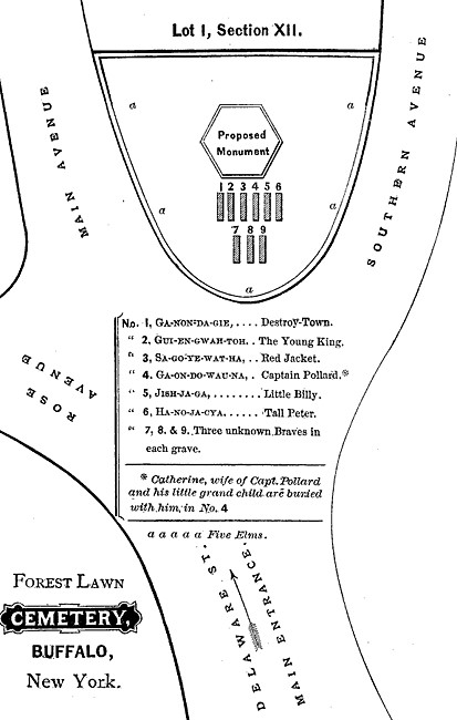 In 1885, the Buffalo Historical Society recorded everything related to the removal and reburial of Red Jacket's remains and other Senecas by publishing an entire volume dedicated to Red Jacket. In the introduction they said, "The project of re-interring the remains of Red Jacket and of contemporary chiefs, lying in neglected graves in the vicinage of Buffalo, has for a score of years been discussed and advocated by prominent members of the Buffalo Historical Society. In public addresses, on different occasions, Messrs. Lewis F. Allen, Orlando Allen, Orsamus H. Marshall, William P. Letchworth and others have, in earnest and touching language, urged the measure as a fitting and pious duty toward the distinguished chiefs and leaders of the hapless aborigines whom we have dispossessed...On the twenty-ninth day of December, 1863, the late Chief Strong...delivered a lecture, the theme of which was Red Jacket. He concluded with an eloquent appeal, addressed to his white brethren, to rescue the remains of Red Jacket and other eminent chiefs from threatened profanation and bury them in Forest Lawn Cemetery."